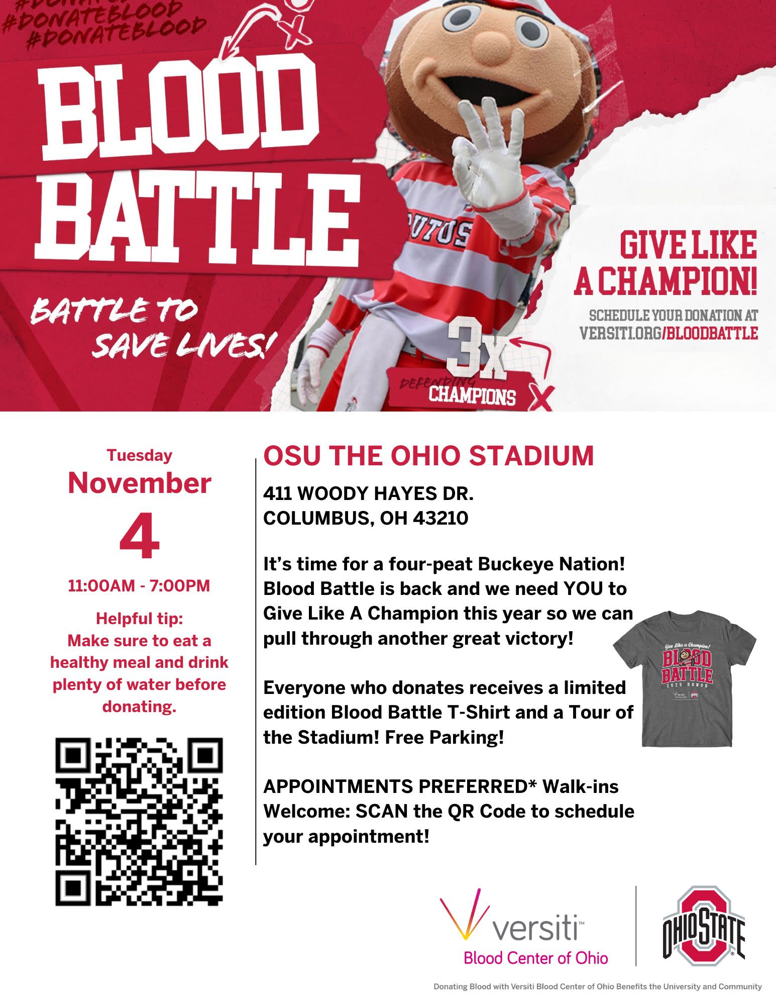 OSU THE OHIO STADIUM Recruit Room (Gate 30 - Near Tuttle Park Place) Tuesday, November 04, 2025 11:00 am - 07:00 pm EDT 411 WOODY HAYES DR. COLUMBUS, OH 43210 Donors will receive a Blood Battle T-Shirt, have an opportunity to take a Stadium Tour, and meet special guests throughout the day including Beanie Wells and Brutus! Free Parking in Surface Lot or at the Tuttle Park Place Garage. Enter at Gate 30 near Tuttle Park Place and Join us in the Recruit Room!