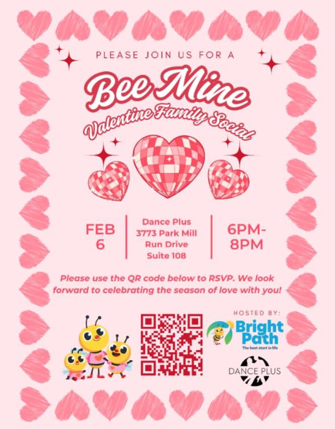 Love is in the air! ❤️ Join us for a FREE Valentine Family Social filled with snacks, music, and dancing for the whole family! 💃 Bring your favorite people and celebrate together! Register for the event at https://forms.gle/AKPr6fUvRU6qZCNj9