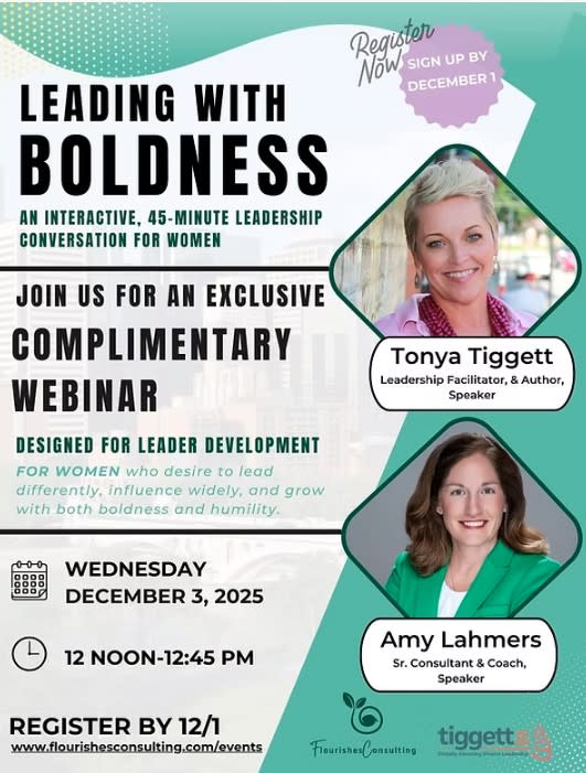 Wednesday, December 3, 2025, 12 noon-12:45 pm - Complimentary Webinar Speakers: Tonya Tiggett, Leadership Facilitator & Author and Amy Lahmers, Sr. Consultant & Coach Join us for an exclusive complimentary webinar, designed for leader development. For women who desire to lead differently, influence widely, and grow with both boldness and humility. Register by 12/1 to attend at: www.flourishesconsulting.com/events Questions? Contact: amy@flourishesconsulting.com